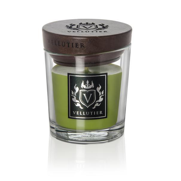 Mała świeca zapachowa Vellutier o aromacie dębu, mchu, białego cedru i ambry dopełnionych nutami bergamotki, kardamonu, kaszmiru i żywicznego galbanum.